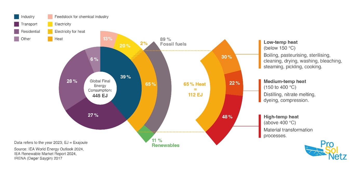 A collector field heats a process fluid by means of solar radiation and a heat exchanger transfers this heat to a supply system or production process in the factory as hot water, air flow or steam. Storage units make it possible to use the generated heat at night-time.