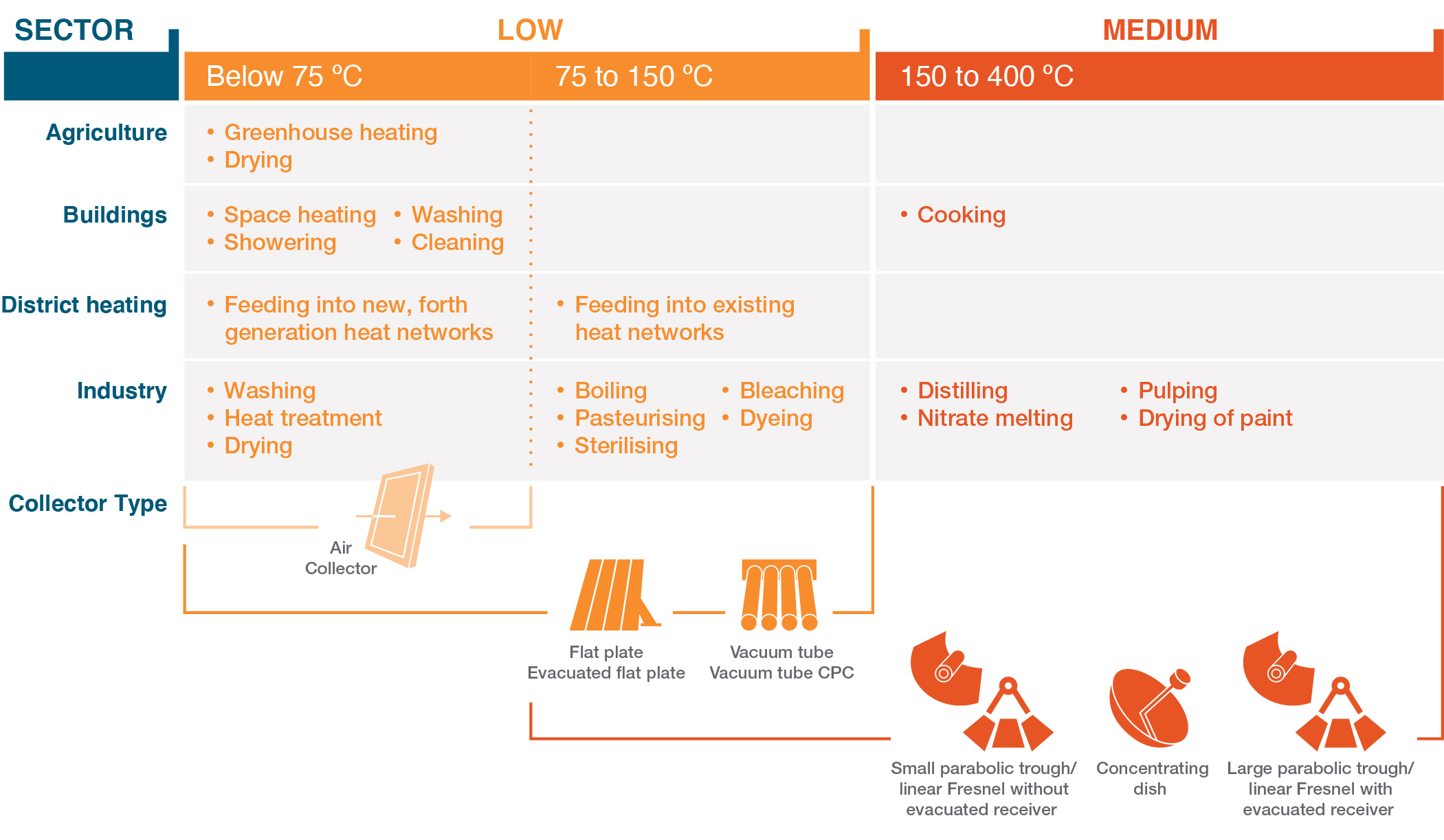 For solar thermal systems, the collector type depends on the type of client with its required temperature. The necessary solar thermal equipment for various temperature levels have a significant impact on the costs.