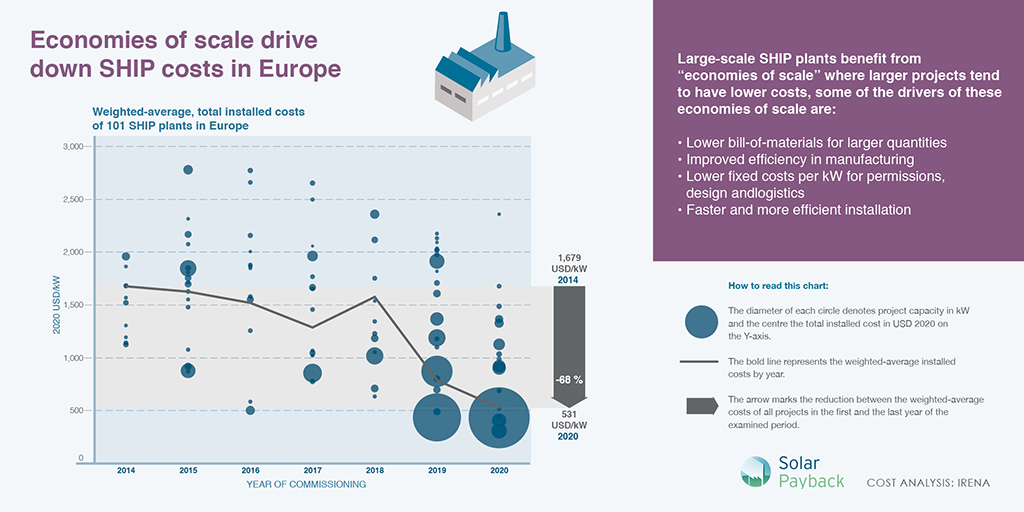 This chart illustrates weighted-average total installed costs of 101 SHIP plants in Europe – commissioned between 2014 and 2020. At the end of the observed periods the market profited from large-scale SHIP plants which tend to have lower costs because of “economies of scale”.