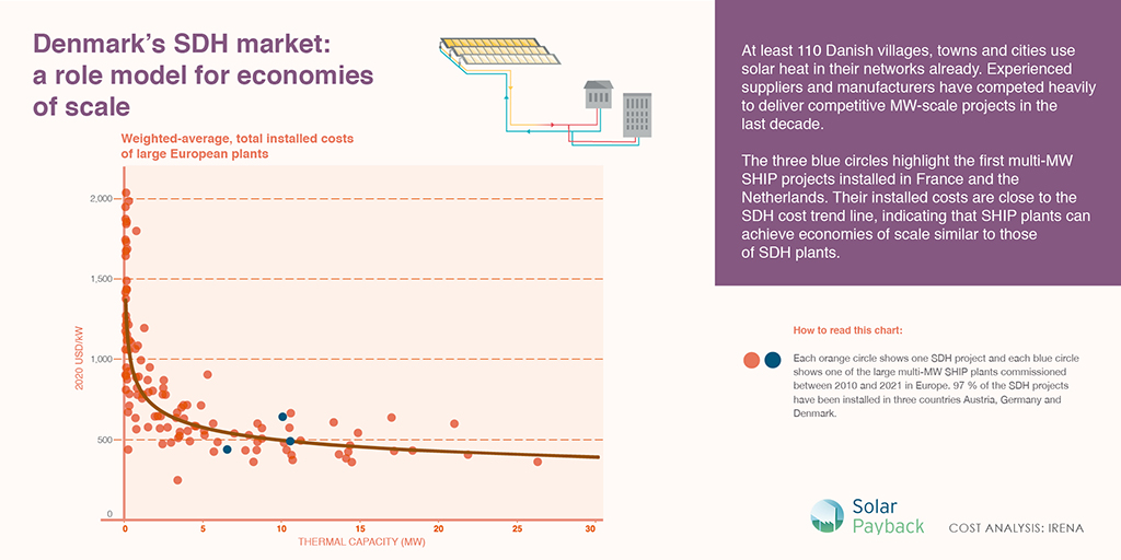 The European SDH market has achieved great economies of scale due to Denmark’s leading role. Each orange circle shows one SDH project and each blue circle shows one of the large multi-MW SHIP plants commissioned between 2010 and 2021 in Europe. The trend curve suggests that for every doubling of the size of the plant, total installed costs will decline by 14 %.