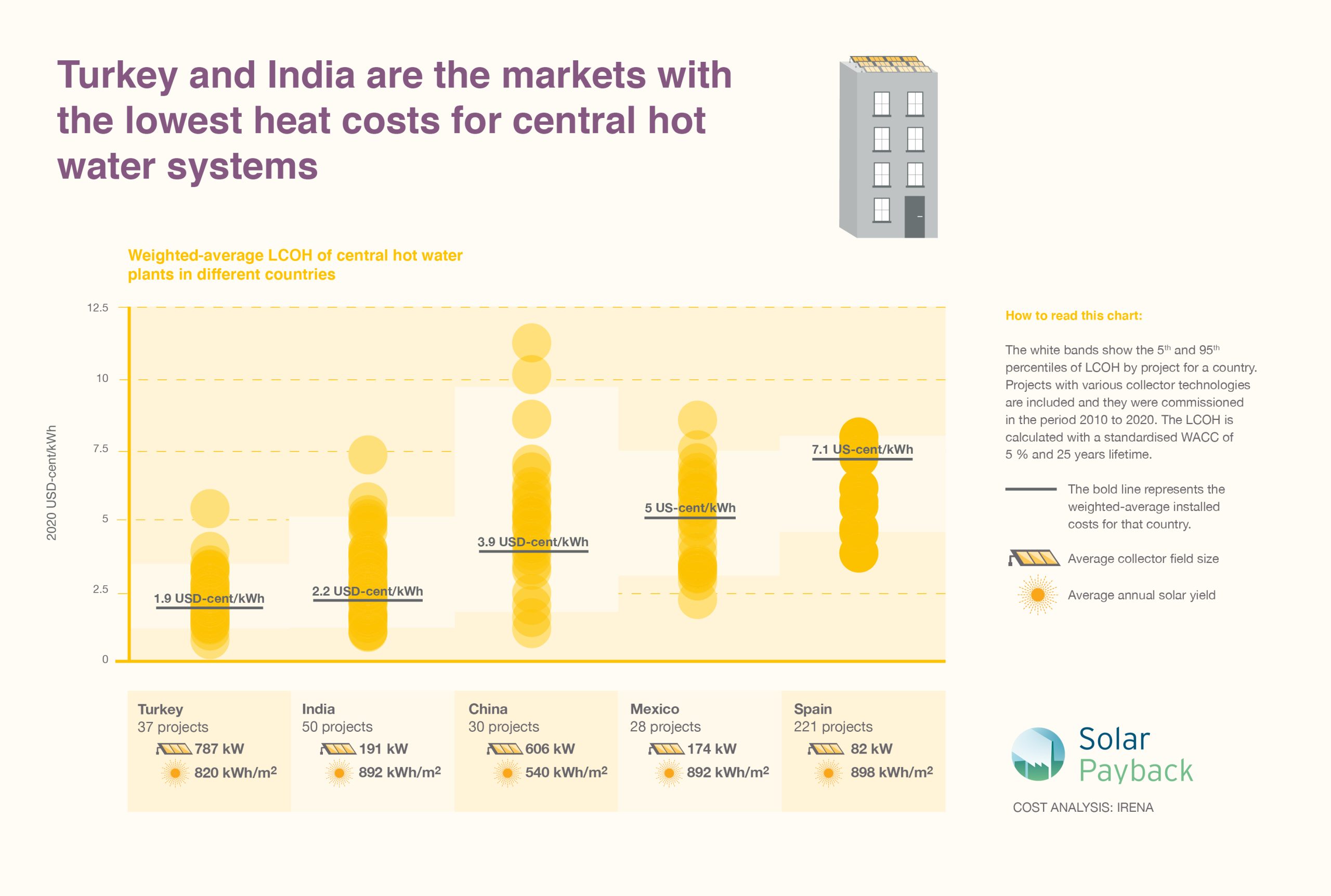 Turkey and India are the markets with the lowest heat costs for central hot water systems. China ranks third with significantly lower average yield of the systems.