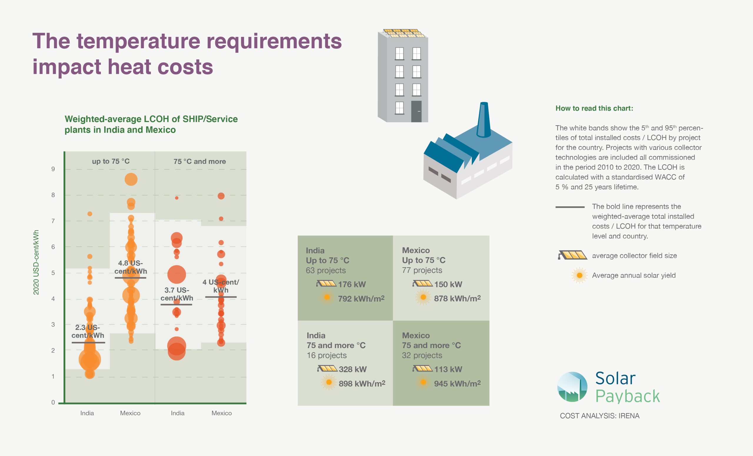 The chart shows the weighted-average levelised cost of heat for large solar thermal systems in Mexico and India on two temperature levels. In the range up to 75 °C the lower average costs in India are impacted by several solar thermal systems for public swimming pools with higher yields. Above 75 °C the costs in both countries are close together at around 4 USD-cent/kWh.