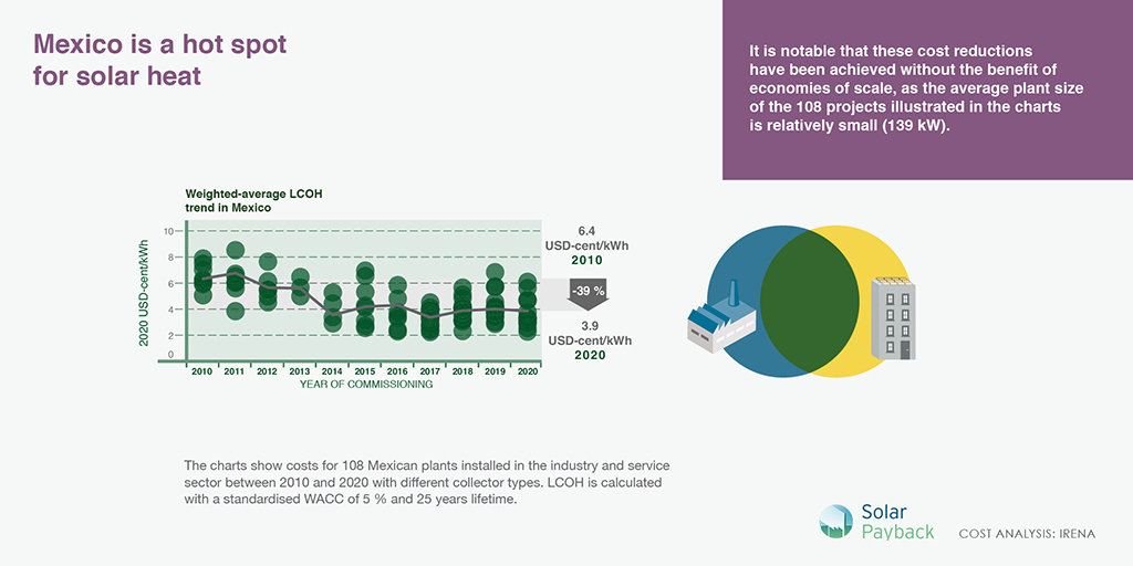 In Mexico, the costs of commercial and industrial solar heat plants have come down 17 % in the last decade due to production output optimisations, more efficient logistics and high competition between well-established project developers. The chart shows the weighted-average Levelised Cost of Heat (LCOH) trend in Mexico between 2010 and 2020.