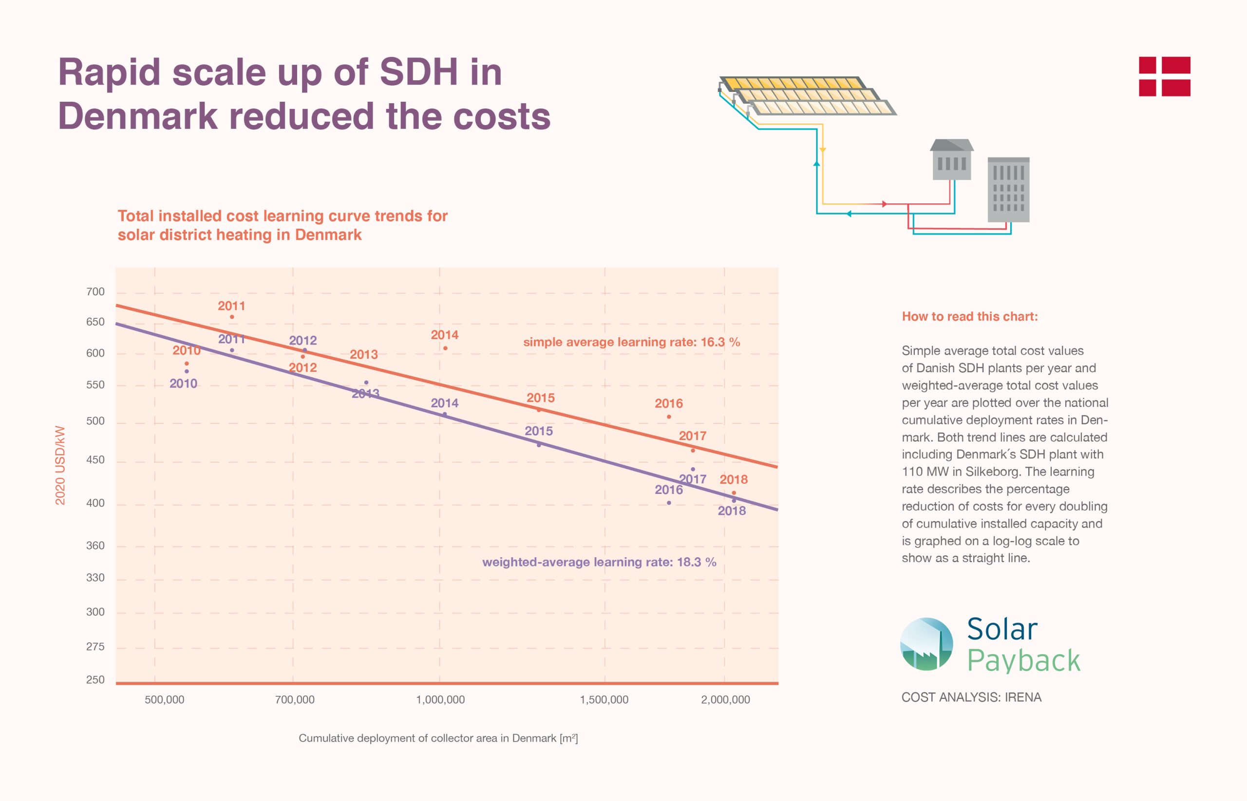 In this chart simple average total cost values of Danish solar district heating plants per year and weighted-average total cost values per year are plotted over the national cumulative deployment rates in Denmark. Both trend lines are calculated including the Danish plant with 110 MW in Silkeborg. The learning rate describes the percentage reduction of costs for every doubling of cumulative installed capacity and is graphed on a log-log scale to show as a straight line.