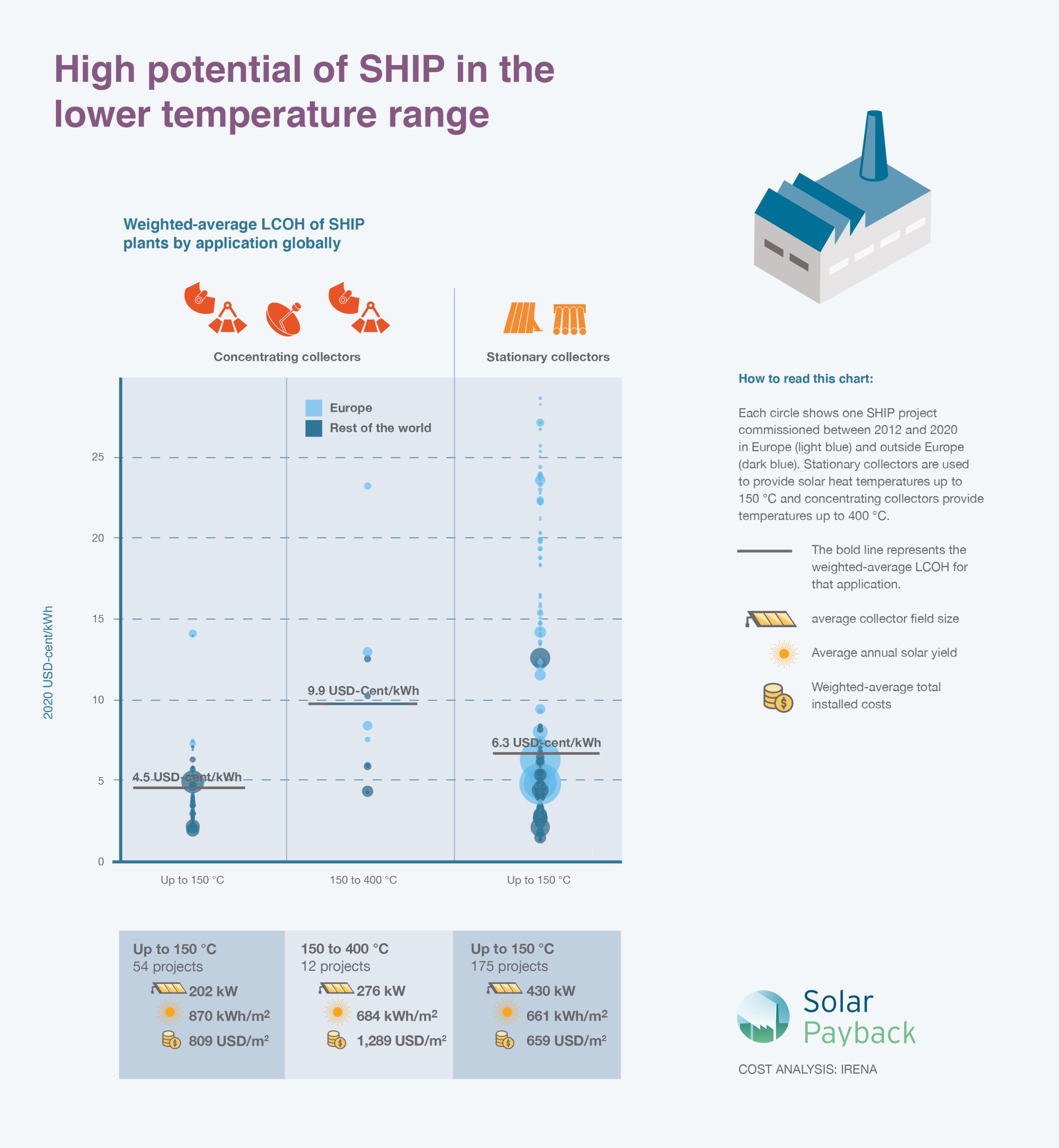 On this chart each circle shows one SHIP project commissioned between 2012 and 2020 in Europe (light blue) and outside Europe (dark blue). Stationary collectors are used to provide solar heat temperatures up to 150 °C and concentrating collectors provide temperatures up to 400 °C.
