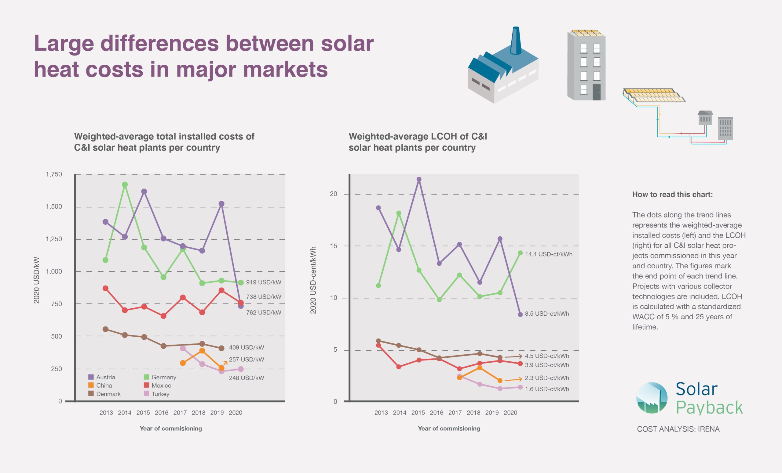 Weighted-average total installed costs and levelised cost of heat are shown for all commercial & industrial solar heat plants in major markets. The figures mark the end point of each trend line. Projects with various collector technologies are included.